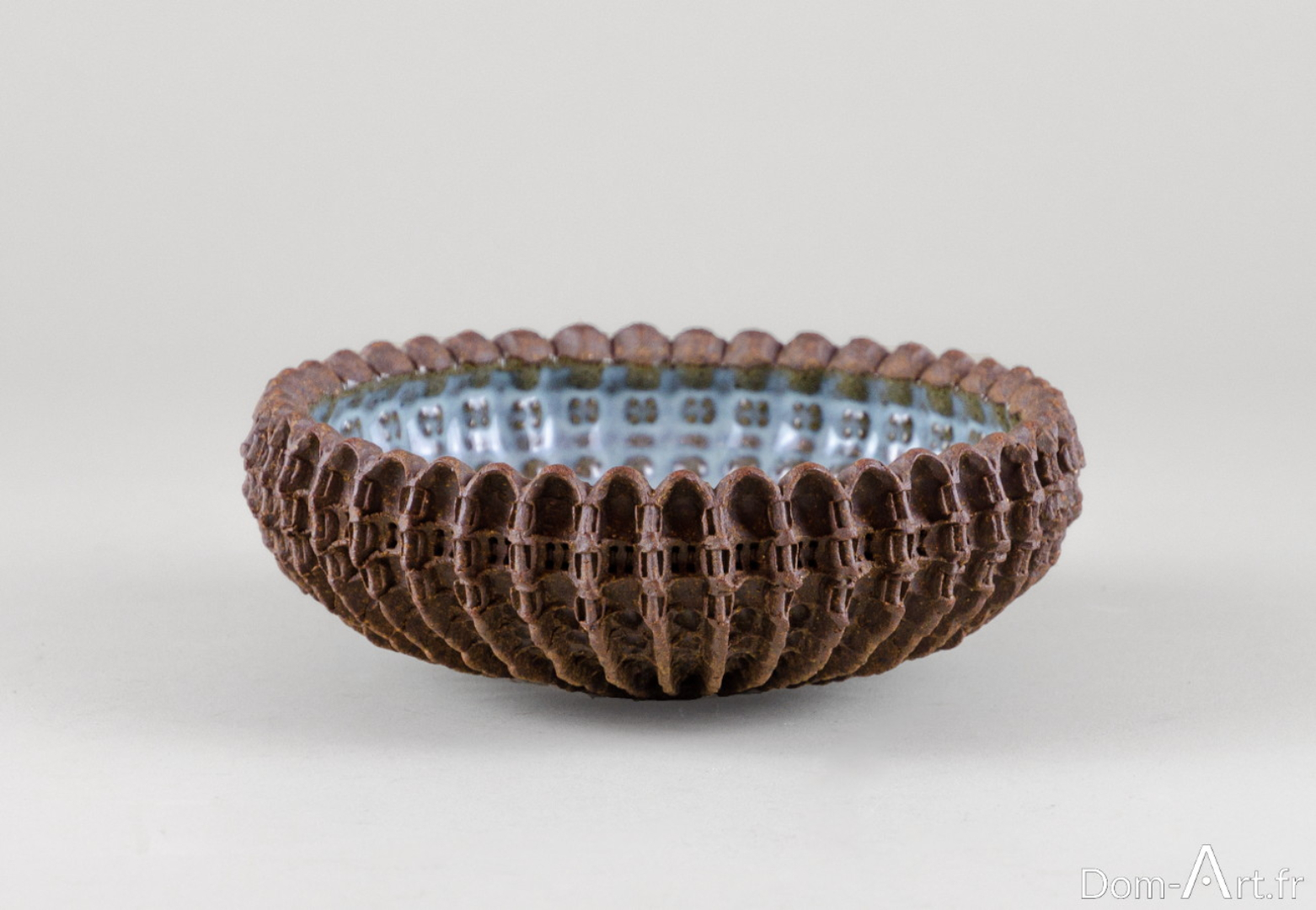 Souvent, des milliers d’interventions sur un même bol sont nécessaires pour qu’il acquière une précieuse intemporalité tout en demeurant « objet usuel ». Il trace, sur la surface de ses bols, grosses cupules, un maillage précis, une architecture complexe. Pour le regard attentif, il imprime à la matière bien plus qu’une simple ornementation. Plus qu’un traitement de surface, c’est toute la paroi du bol qui s’en trouve transformée jusqu’à l’intérieur, apportant une réponse à ce qui se fait au dehors.